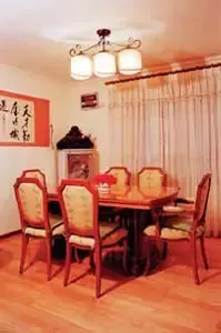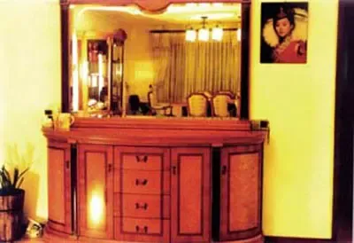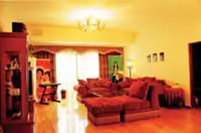 客厅中的沙发是套玫瑰红的沙发,布料的图案为亦古亦今的暗底团花图形。范冰冰的父母介绍说,这组沙发有点欧式的感觉,显得比较高档,也比较舒适,且还有可变性。